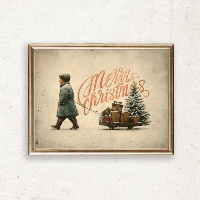 ヴィンテージ クリスマスポスター|子どもとツリーの冬イラスト|レトロな文字デザインの壁掛けアート