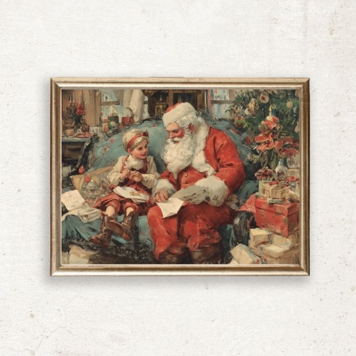 北欧ヴィンテージ クリスマスポスター|サンタと子どもの絵