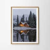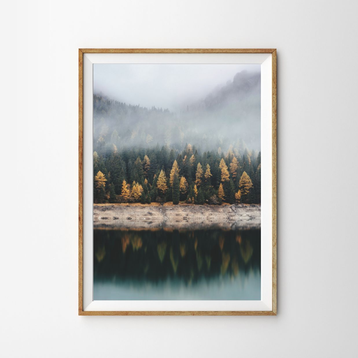 霧の森と湖の反射 | 冬の北欧フォトポスター|ナチュラルインテリア向けウォールアート
